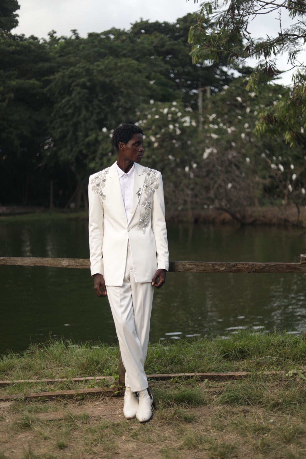A touch of the divine. This exquisite white jacket, adorned with intricate beadings, offers a glimpse of celestial luxury. Tailored for effortless elegance.